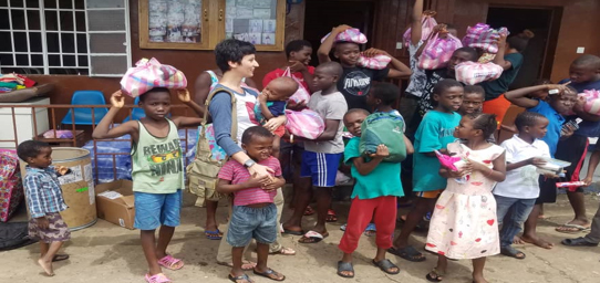 Children receiving their monthly Clothing Supplies